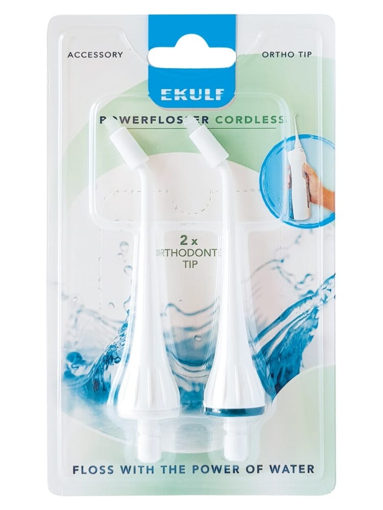 Passer til EKULF PowerFlosser Cordless Art.nr 1690. Orthodontic tip er spesiellt designet for de med tannregulering, den rengjør de vanskeligst tilgjengelige områdene