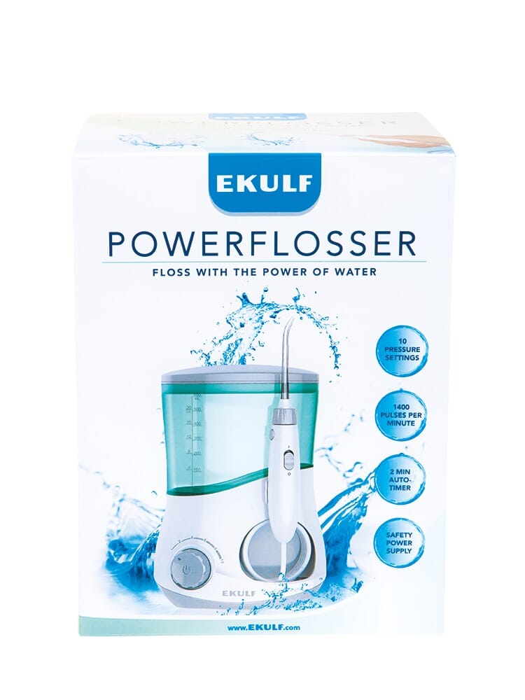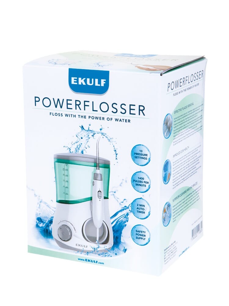 PowerFlosser fjerner plakk og bakterier mellom tennene og dypt ned i tannkjøttlommene der vanlig tanntråd ikke kommer til. Vannstrålen pulserer 1400 ganger pr minutt, masserer tannkjøttet og gir en øket blodsirkulasjon. Holder tannkjøttet ditt friskt og sterkt og er mere skånsomt enn tradisjonell tanntråd. Tippen kan roteres 360 grader og strålen gjør det enklere å rengjøre rundt tannreguleringer, broer og implantater. Vannbeholderen rommer 6 dl vann og har en 1 m lang vannslange for at man enkelt skal kunne bruke den i baderommet. Powerflosseren har automatisk avstengning etter 2 minutter og har et minimalt lydnivå. Powerflosseren levereres med 3 x Standard Nozzle tip som løsner plakk mellom tennene og dypt ned i tannkjøttlommene og 1 x Tongue scraper som er perfekt for å rengjøre tungens overflate fra bakterier, matrester samt døde celler.