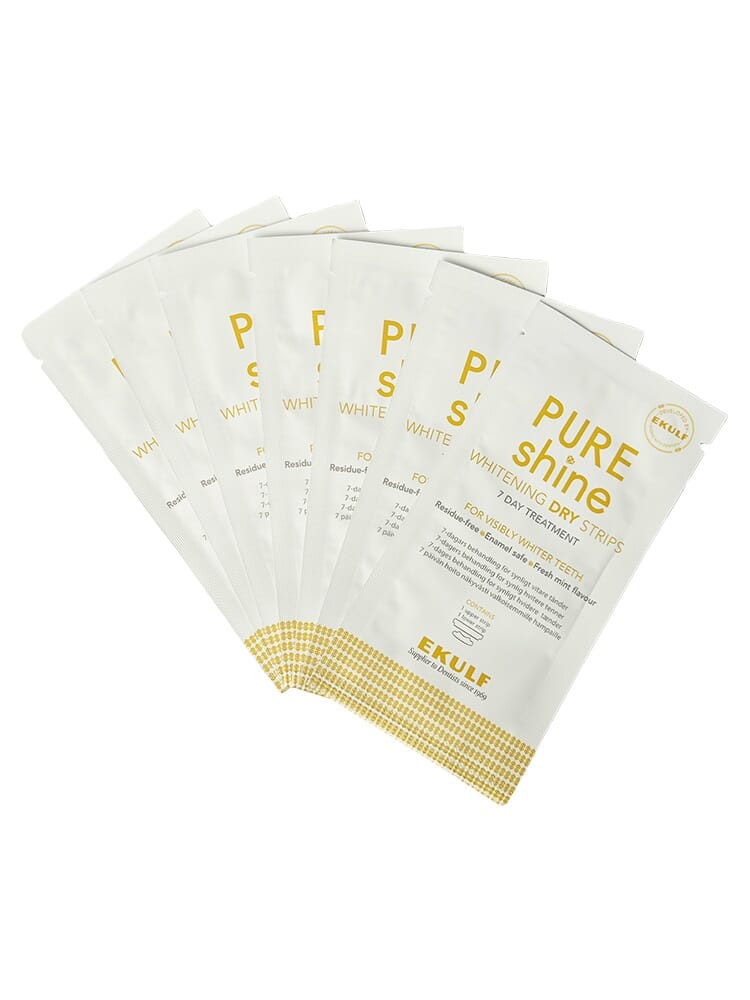 PURE shine Whitening Dry Strips fra EKULF gir deg naturlig hvitere tenner på bare 7 dager – enkelt og skånsomt hjemme. De tynne, transparente stripsene har en avansert, tørr formel som holder seg godt på plass uten å klisse, og et diskret design som knapt er synlig ved bruk. Stripsene tilpasser seg tennenes form takket være en innovativ gelteknologi som aktiveres ved kontakt med spytt – og gir en jevn og effektiv bleking. Den aktive ingrediensen PAP (Phthalimidoperoxycaproic Acid) løser skånsomt opp overfladiske misfarginger – helt uten hydrogenperoksid. Produktet er trygt for emaljen, skånsomt mot tannkjøttet og etterlater ingen gelrester etter bruk.