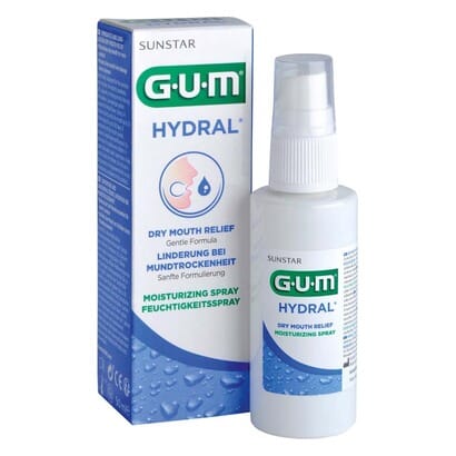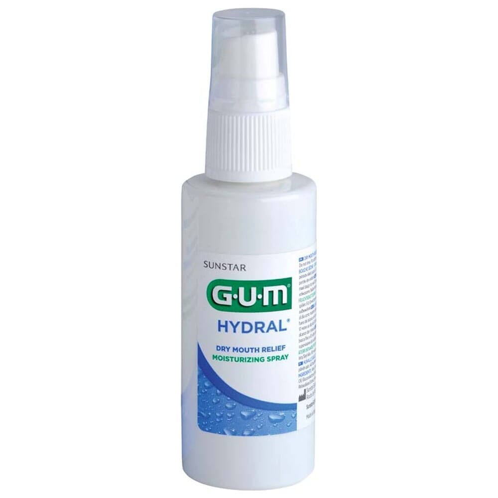 GUM Hydral er en fuktighetsgivende spray som kan brukes mange ganger om dagen. I tillegg til å fukte tørr munn, beskytter den munnslimhinnen for irritasjon og fremmer tilheling av bløtvev.