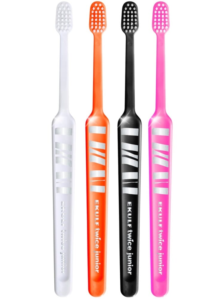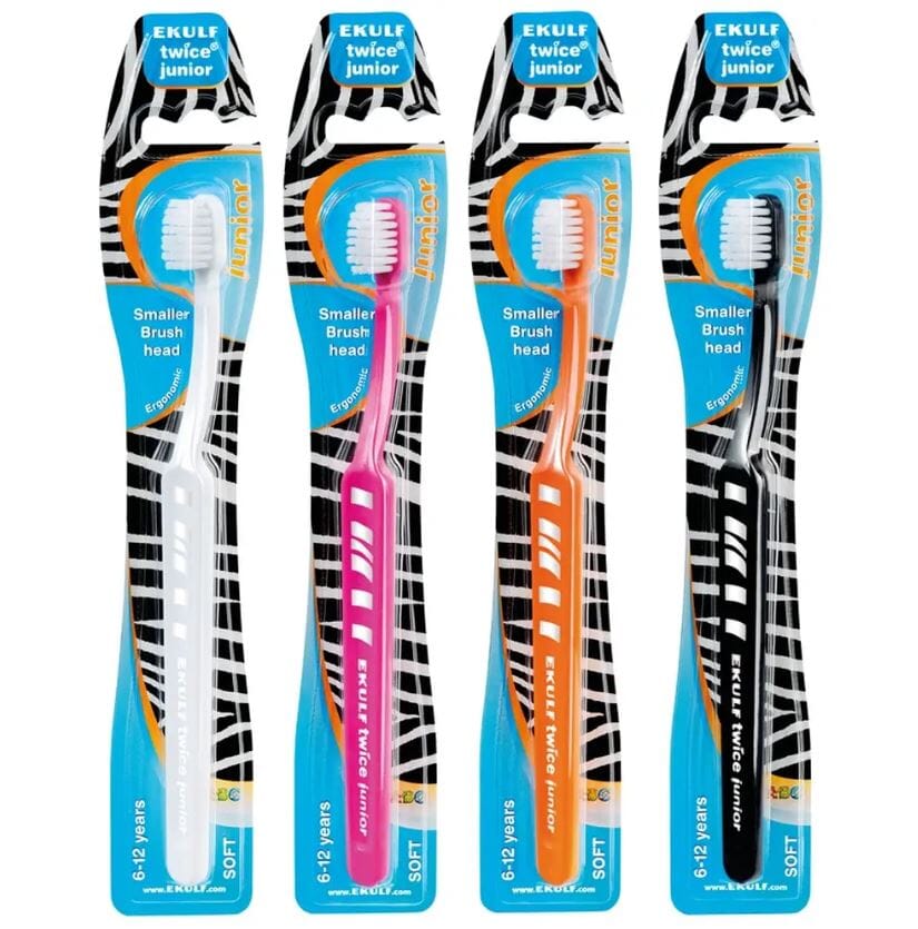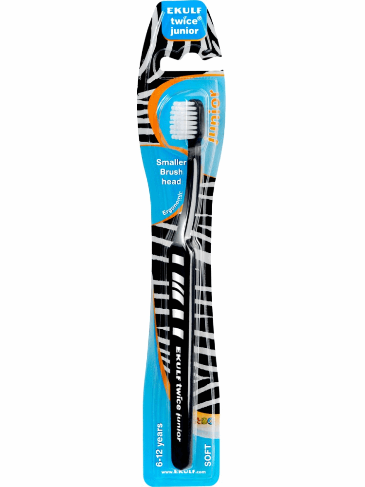 EKULF twice junior 6-12 år, er en tannbørste som er tilpasset etter tennene og munnens størrelse samt individens alder. Den nye kompakte utformete børsten har rundtformede topper og består av myke børstestrån dette gjør at pussing av tennene og tannkjøttet skjer så på en skånsom måte. Børstehodet er betydeligt mindre en på en vanlig tannbørste. Dette gjør at den enklere kan kommet til å pusse på alle tannoverflatene.Med det lange, ergonomiske skaftet kan både foreldre og barn holde tannbørsten samtidig. Ettersom skaftet har den bøyde utformingen kan tannbørsten hvile stødig i hånden og man lett enkelt til de bakre tennene. Håndtaket er laget av polypropylene og børstefibrene av polyamide slik at det er enkelt å gjenvinne den fra myljøsynspunkt. Levereres i blister i fargene hvit, oransje, sort og rosa.