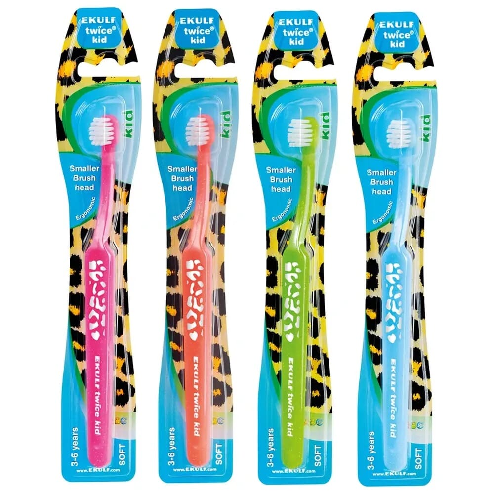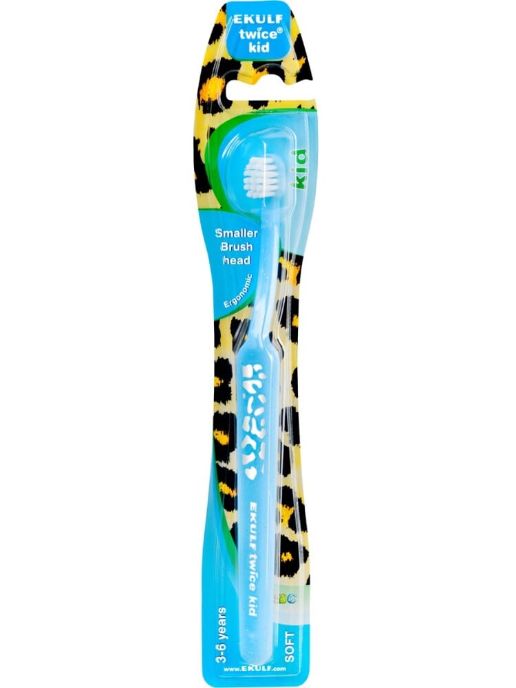EKULF twice kid 3-6 år, er en tannbørste som er tilpasset etter tennene og munnens størrelse samt individens alder. Den nye kompakte utformete børsten har rundtformede topper og består av myke børstestrå dette gjør at pussing av tennene og tannkjøttet skjer så på en skånsom måte. Børstehodet er betydeligt mindre en på en vanlig tannbørste. Dette gjør at den enklere kan kommet til å pusse på alle tannoverflatene.Med det lange, ergonomiske skaftet kan både foreldre og barn holde tannbørsten samtidig. Ettersom skaftet har den bøyde utformingen kan tannbørsten hvile stødig i hånden og man lett enkelt til de bakre tennene. Håndtaket er laget av polypropylene og børstefibrene av polyamide slik at det er enkelt å gjenvinne den fra miljøsynspunkt